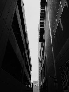 ビルと立体駐車場との間に視線が走る